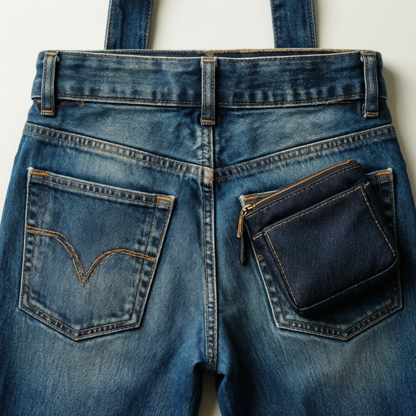 - Если используете карман от джинсов как декор/отделение, примерьте его на лицевой панели до раскроя окончательной формы.
