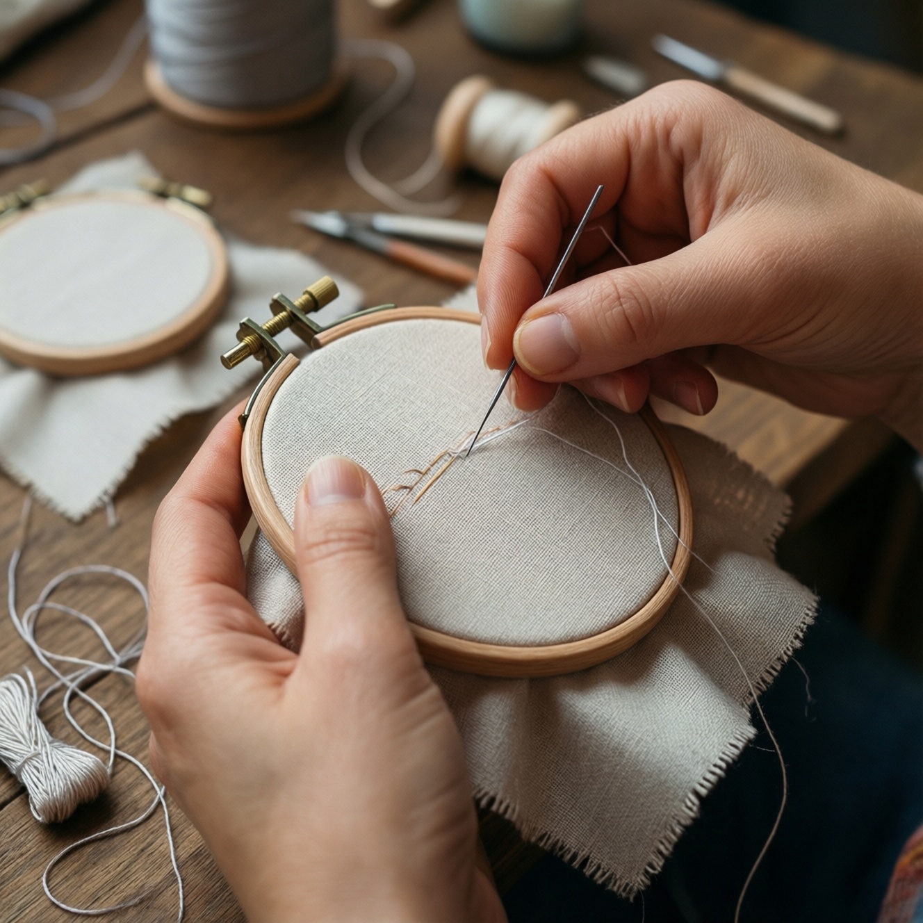 • Нет пялец: используйте плотную ткань и работайте небольшими участками, поддерживая основу ладонью; но при первой возможности всё же лучше пяльцы для вышивки купить для стабильного натяжения.