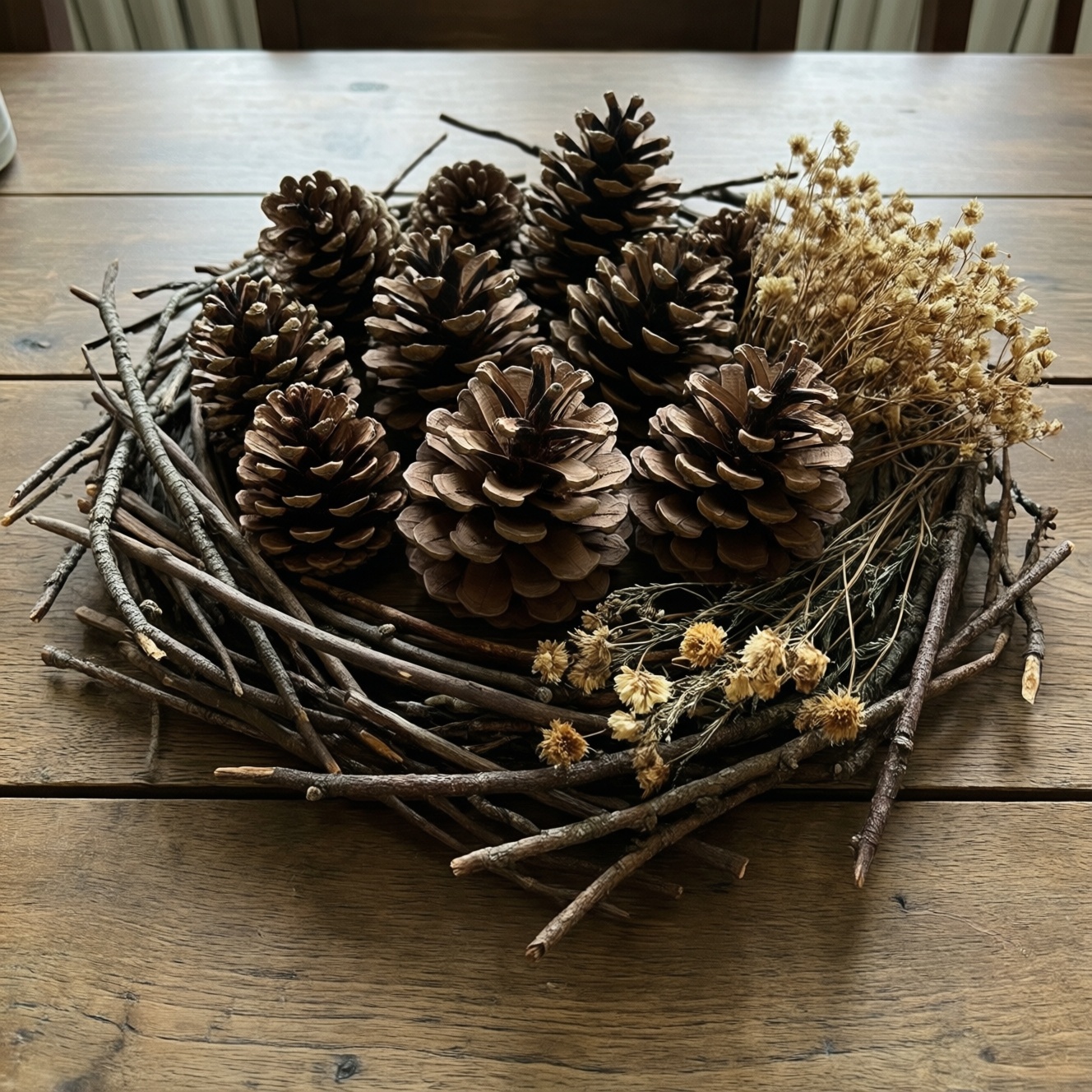 Когда нет времени на сушку и карантин, или есть аллергики в доме. В этом случае разумно "декор из шишек купить" или взять подготовленные сухоцветы под конкретную палитру.