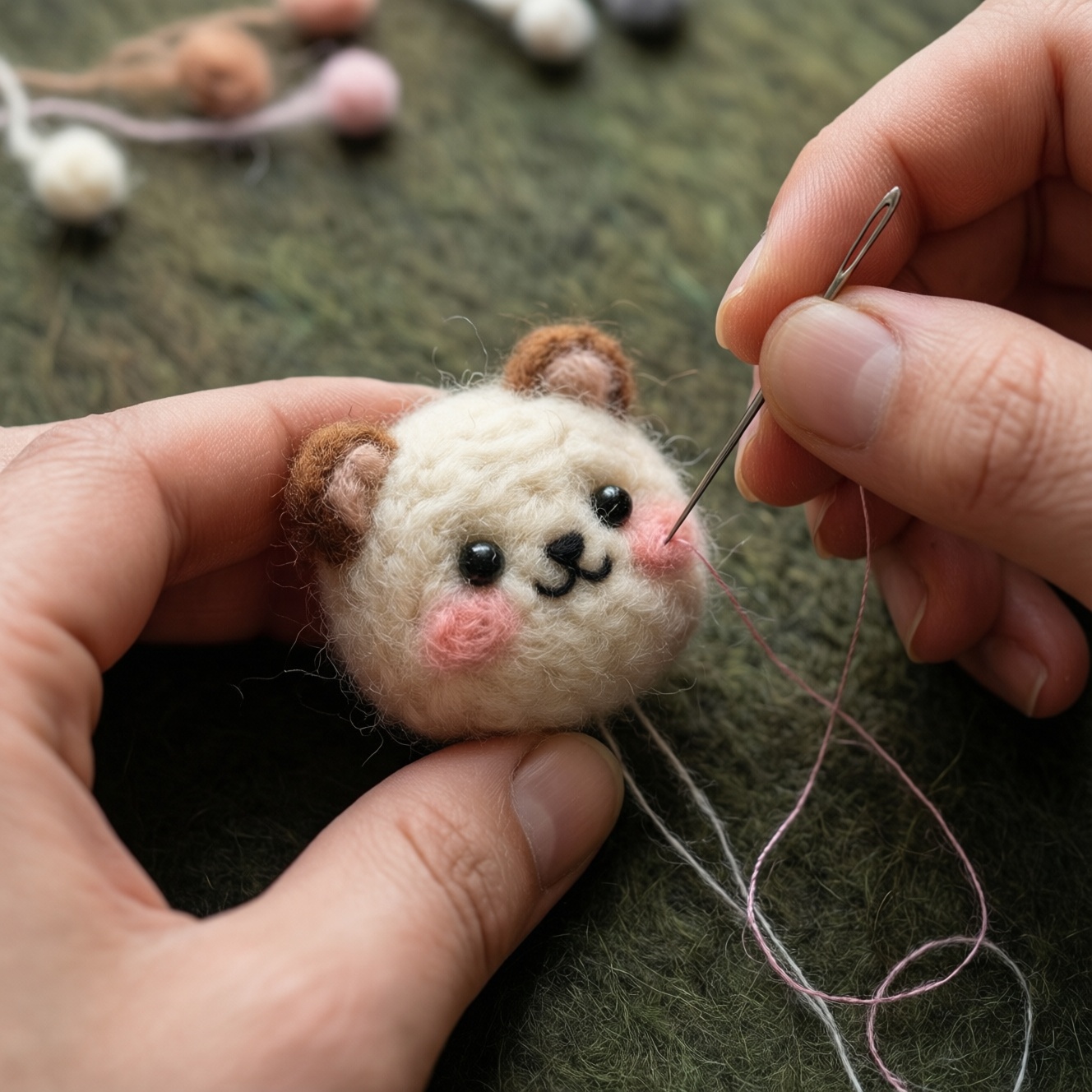 - Лапки/ушки: валяйте до средней плотности, оставляя пушистый край для крепления; затем укрепляйте стык, вращая игрушку на подложке.