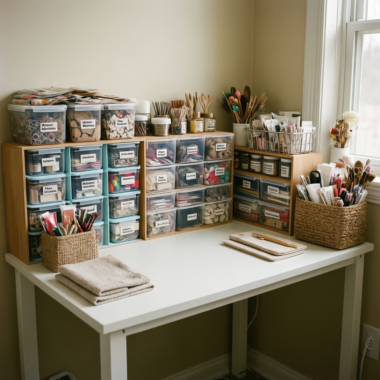 - "Двухуровневый запас" - уместно при больших объёмах: рабочий минимум рядом, основной запас отдельно (верхняя полка/под кроватью). Так системы хранения для рукоделия не распухают на рабочем месте.